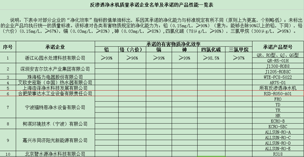 圖為部分反滲透凈水機質量承諾企業(yè)名單及承諾的產(chǎn)品性能一覽表