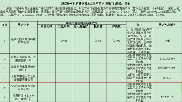 圖為部分超濾凈水機質量承諾企業(yè)名單及承諾的產(chǎn)品性能一覽表