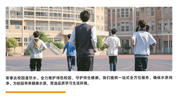 榮事達校園直飲機以其先進的技術優勢,贏得了學校的青睞。設備采用節能熱交換技術,熱損低、更節能;保溫結構設計則確保了良好的保溫效果。六個水龍頭的設計,有效應對了飲水量大與飲水集中的問題,確保了供水的順暢與穩定。 更為值得一提的是,榮事達校園直飲機采用了五級過濾與RO反滲透技術,能夠有效濾除水中的泥沙、鐵銹、重金屬、余氯等有害物質,確保水質干凈、安全。同時,設備還具備智能防護功能,如斷電保護、電子控溫等七重保護機制,充分保障了師生的使用安全。 此外,榮事達校園直飲水還可根據學校的具體需求量身定制直飲方案。從需求分析、方案設計、設備選型到安裝調試、后期運維,榮事達提供了一站式、全方位的服務,確保了直飲水項目的順利實施與高效運行。 03