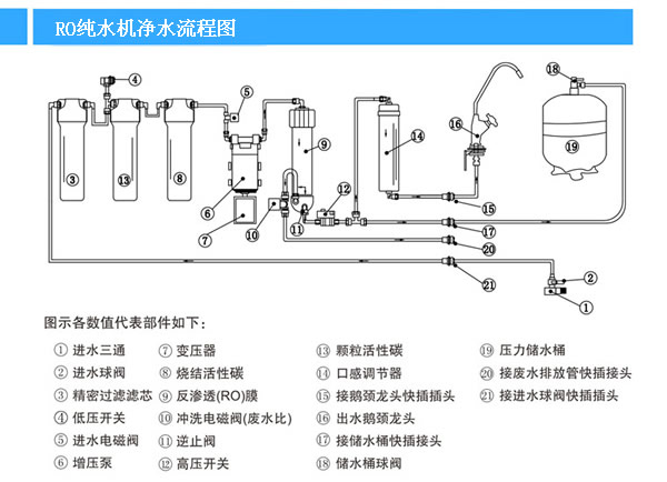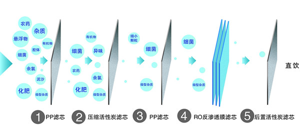 - RO凈水機是采用RO膜凈化污水的凈水產品,對RO凈水機專業知識你知道多少?RO凈水機配件種類:水龍頭,壓力桶,水管,接頭(球閥),機殼,泵,PP濾芯,活性炭濾芯,RO膜,廢水比,逆止閥,高壓開關,低壓開關等。RO凈水機凈水流程:原水通過水管進入RO凈水機的前三級濾芯進行初濾,然后在由增壓泵對水施壓,讓水流RO反滲透膜中,通過RO膜的逆滲透效果精細凈化水源,然后在將水輸送到壓力桶,由壓力桶保存;當需要使用時在打開壓力桶球閥,通過壓力桶施壓讓水流入最后一級T33濾芯(活性炭濾芯,主要為凈化水質口感),在通過鵝頸水龍頭產水詳情可參考凈水機原理。RO凈水機凈水特點:1、采用反滲透技術(RO膜),分離自來水中細微雜質、細菌、重金屬、礦物質污染、化學污染和其他有害物質等,然后在通過T33濾芯分解純水中營養物,提升水質口感和健康。產水干凈,安全,可直接飲用。2、內部配置濾芯價格實惠,更換簡便,制水成本低,五級過濾凈水有保障。3、RO凈水機使用時間長,機器運作噪音小、振動小、使用安全。用水直接開啟水龍頭即可飲用。4、凈水過程全自動實施,使用簡便,缺少或者機器發生故障會自動停機,壓力恢復后自動開啟,自動沖洗RO膜,實現智能化使用。RO凈水機濾芯作用:第一級pp棉濾芯,主要對進入原水初級過濾,能去除水中1微米以上的泥沙,鐵銹,固體污染物等。第二級活性炭濾芯,能吸附水中的異色、異味、氯氣及其他一些對人體有害的物質。第三級是精細PP濾芯,深層凈化水中細菌、化學污染、重金屬等雜質物。第四級是RO膜,經過前三級濾芯處理后,水中部分較大的雜質已經被排除了,RO膜孔徑在0.001微米,主要去除水中除純水之外的其他細小污染物,如:細菌、病毒、余氯等。第五級濾芯是T33(活性炭),它的作用主要是繼續吸附水中殘留異味、異色,同時分解純水中的營養礦物質。
